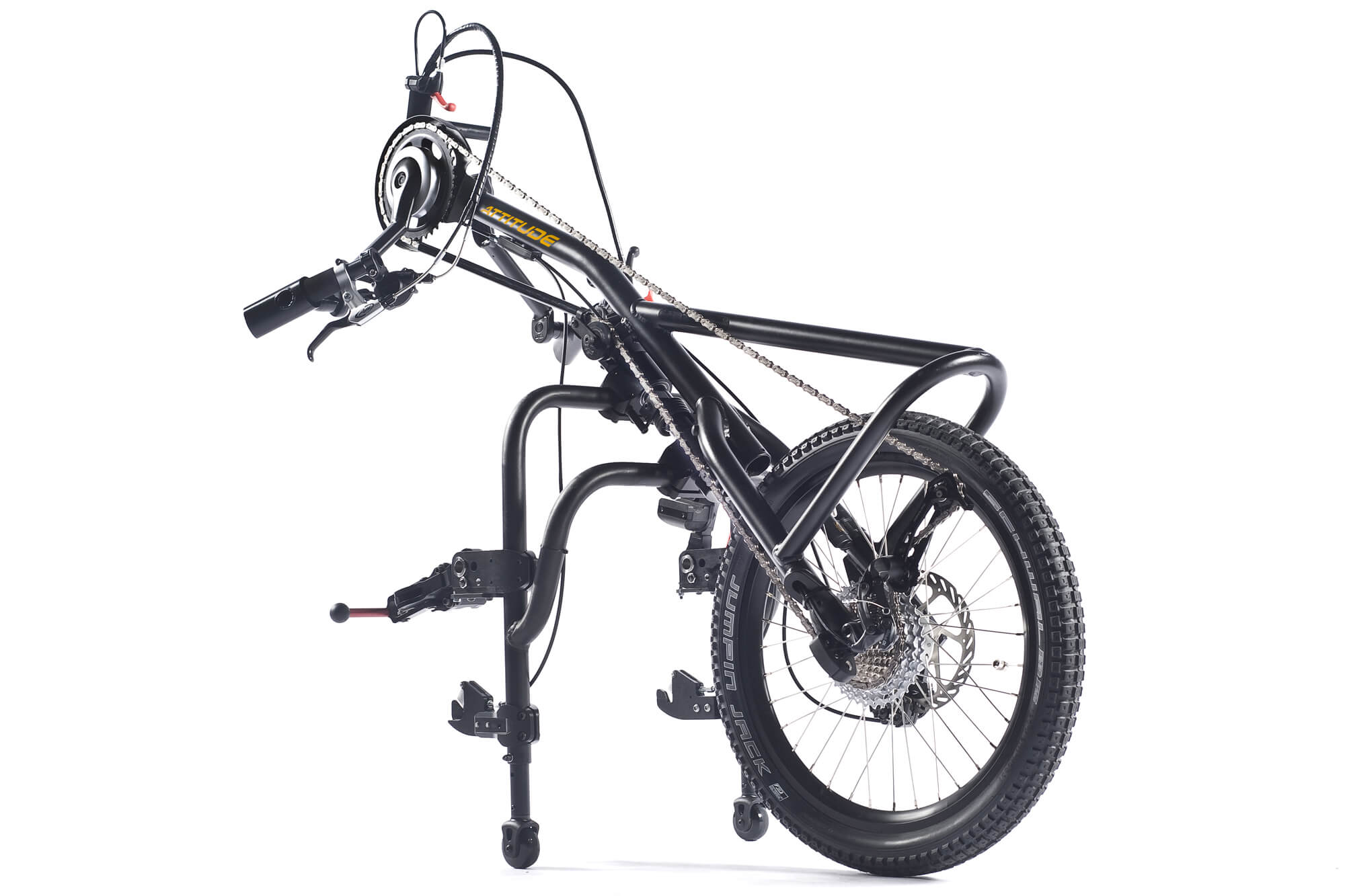 Du kører med stil med en Attitude påspændings-håndcykel – stilfuldt design i alle detaljer. Krumtaparmen og kædeskærmen fås i flere forskellige farver. Vælg din yndlingsfarve!