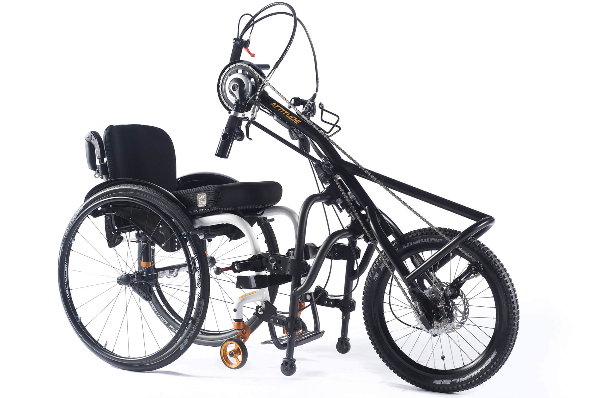 Koblingsmekanismen på en Attitude Manuel håndcykel er så simpel, at det geniale 4-punkts koblingssystem på få sekunder låser sig sikkert fast til fronten af din kørestol, og afmontering sker lige så nemt! Plus, der er ikke behov for beslag eller kabler, der sidder i vejen ved dine knæ, så der er intet der begrænser den komfort du er vant til fra din kørestol.